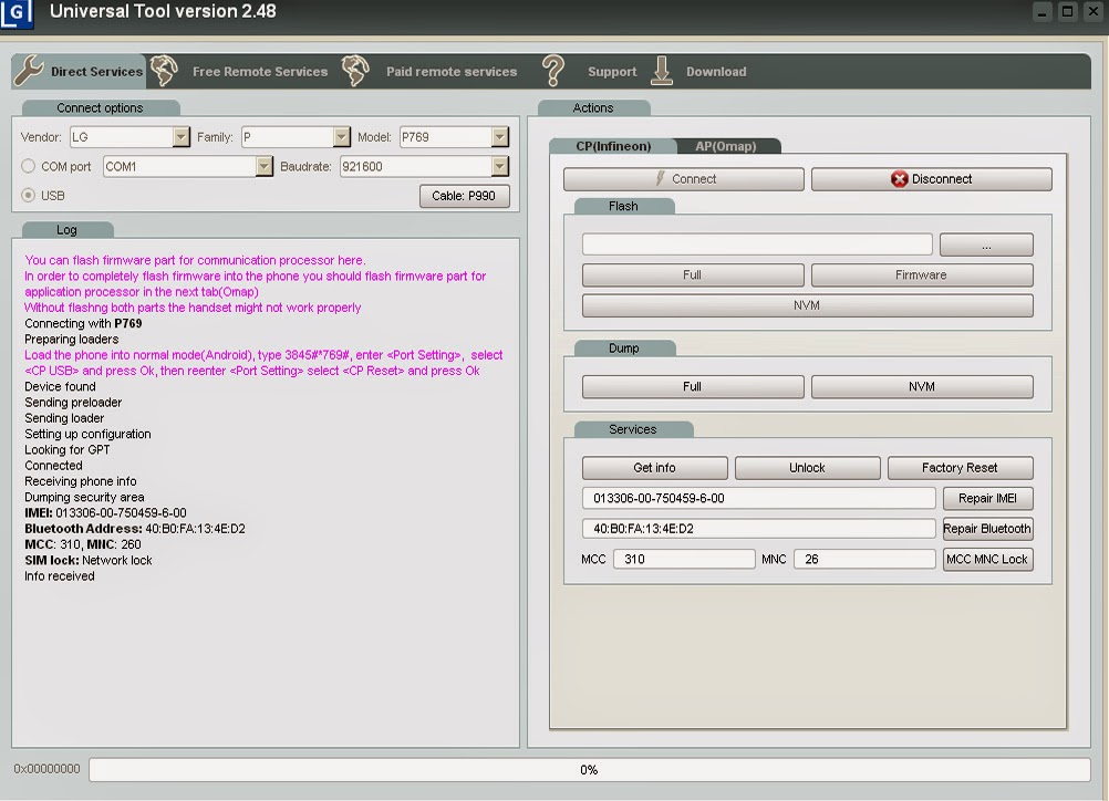 ok abrimos la interface de Lgtool ahi seleccionamos en la opcion vendor LG , en la opcion Family seria la P y en Model p769.
